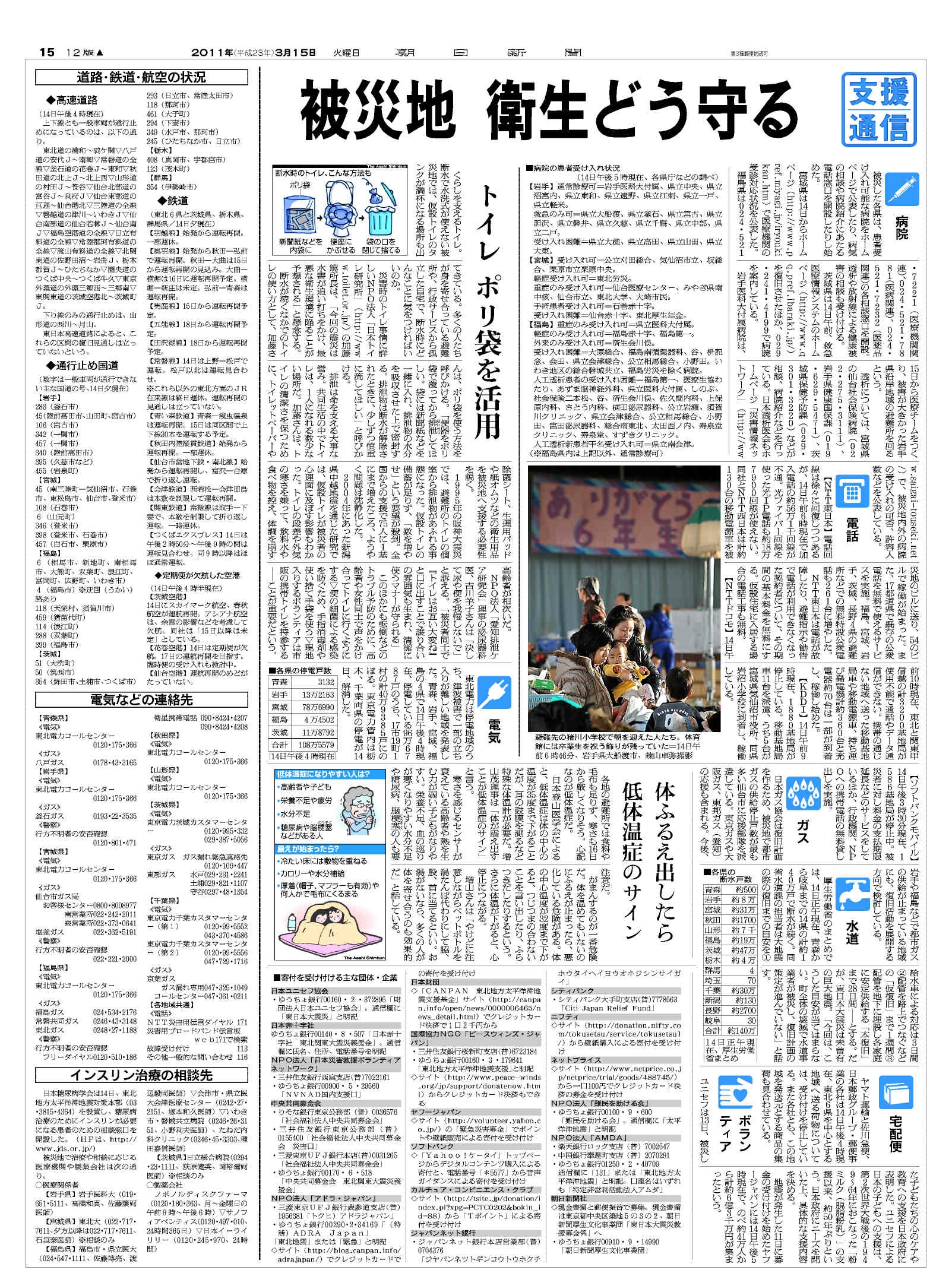 2005年におきたパキスタンでの大地震では低体温症でなくなられた方が沢山出ています。明日(15日)には東北地方の気温が氷点下となる予報が出ております。
