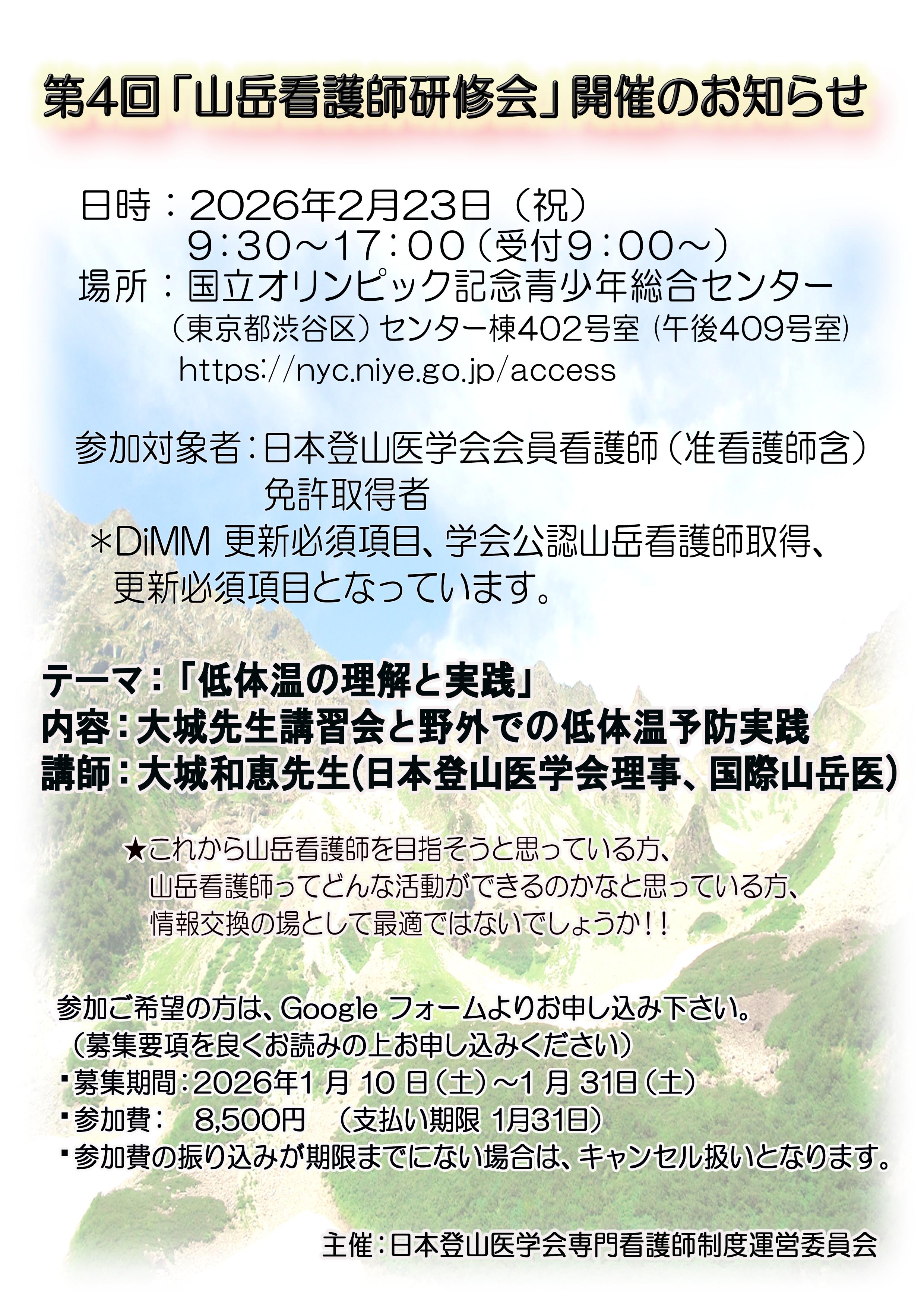 第4回「山岳看護師研修会」のお知らせ(2025/12/9更新)